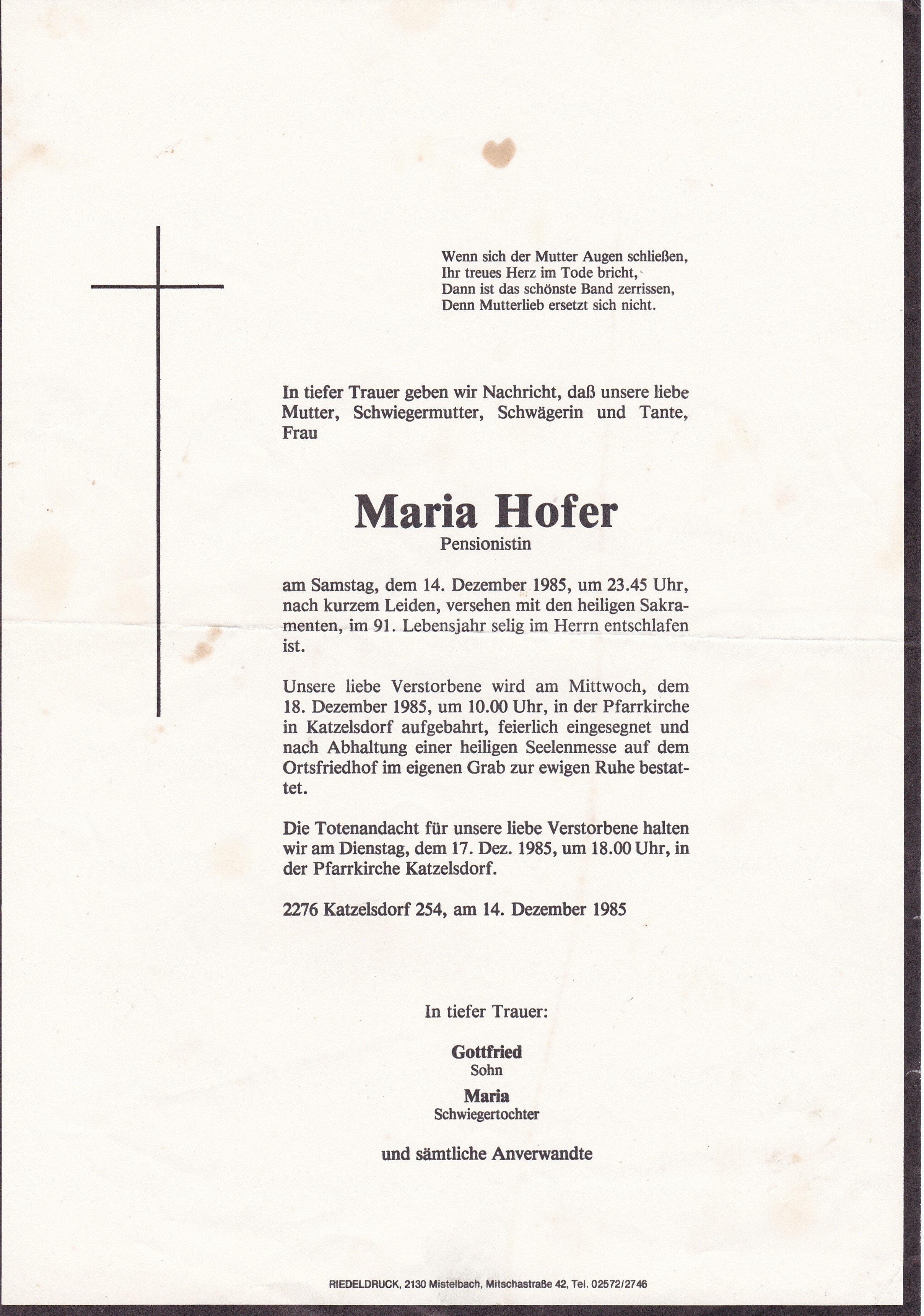 1 Mauer Theresia Schulstraße 60 Bernhardsthal - *19.09.1897 +15.01.1985 |