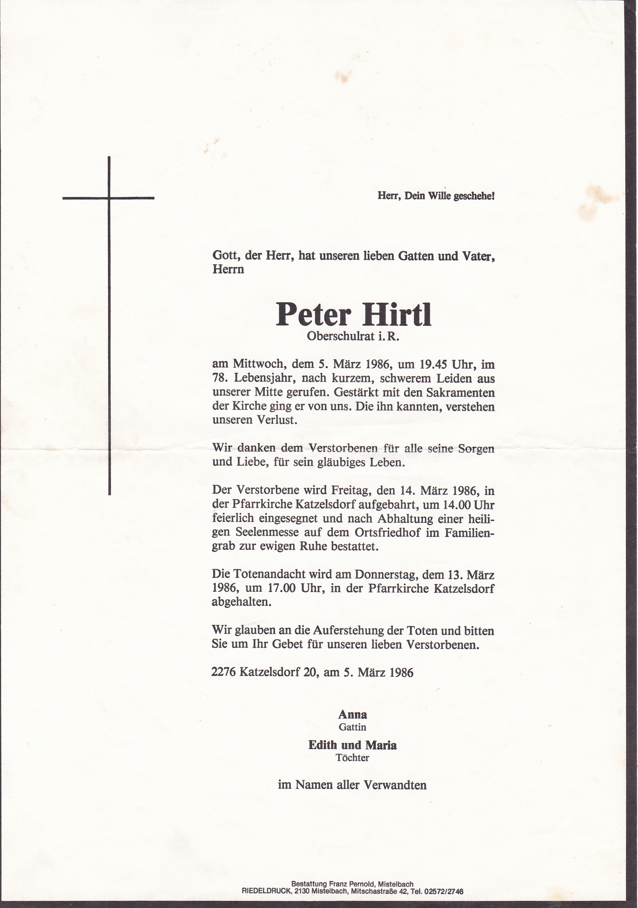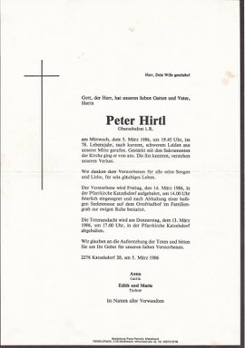 1 Hirtl Peter Hauptstraße 20 - *09.06.1908 +05.03.1986 |