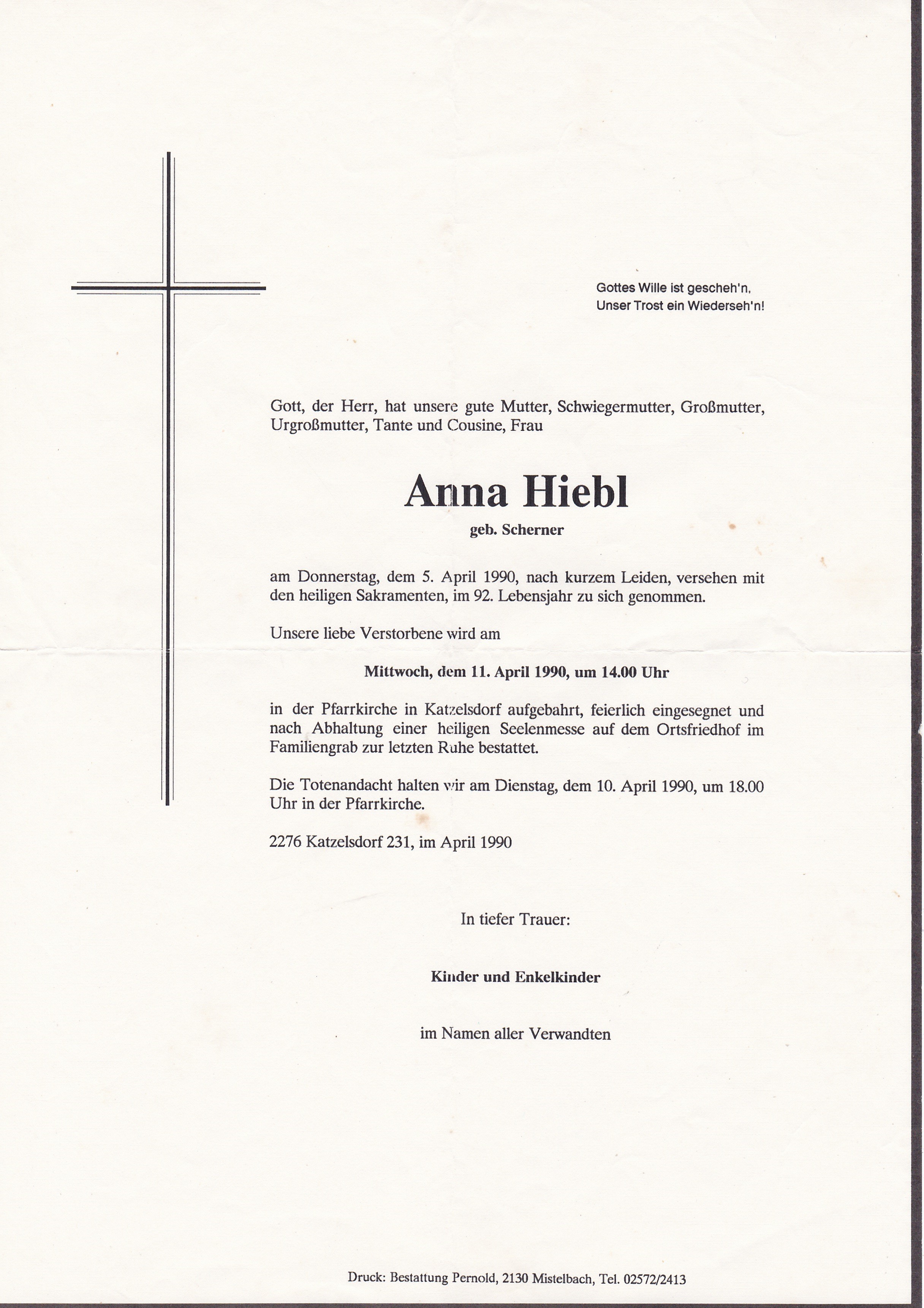 4  Hiebl Anna (Scherner) Bachzeile 231 - *26.11.1898 +05.04.1990 |