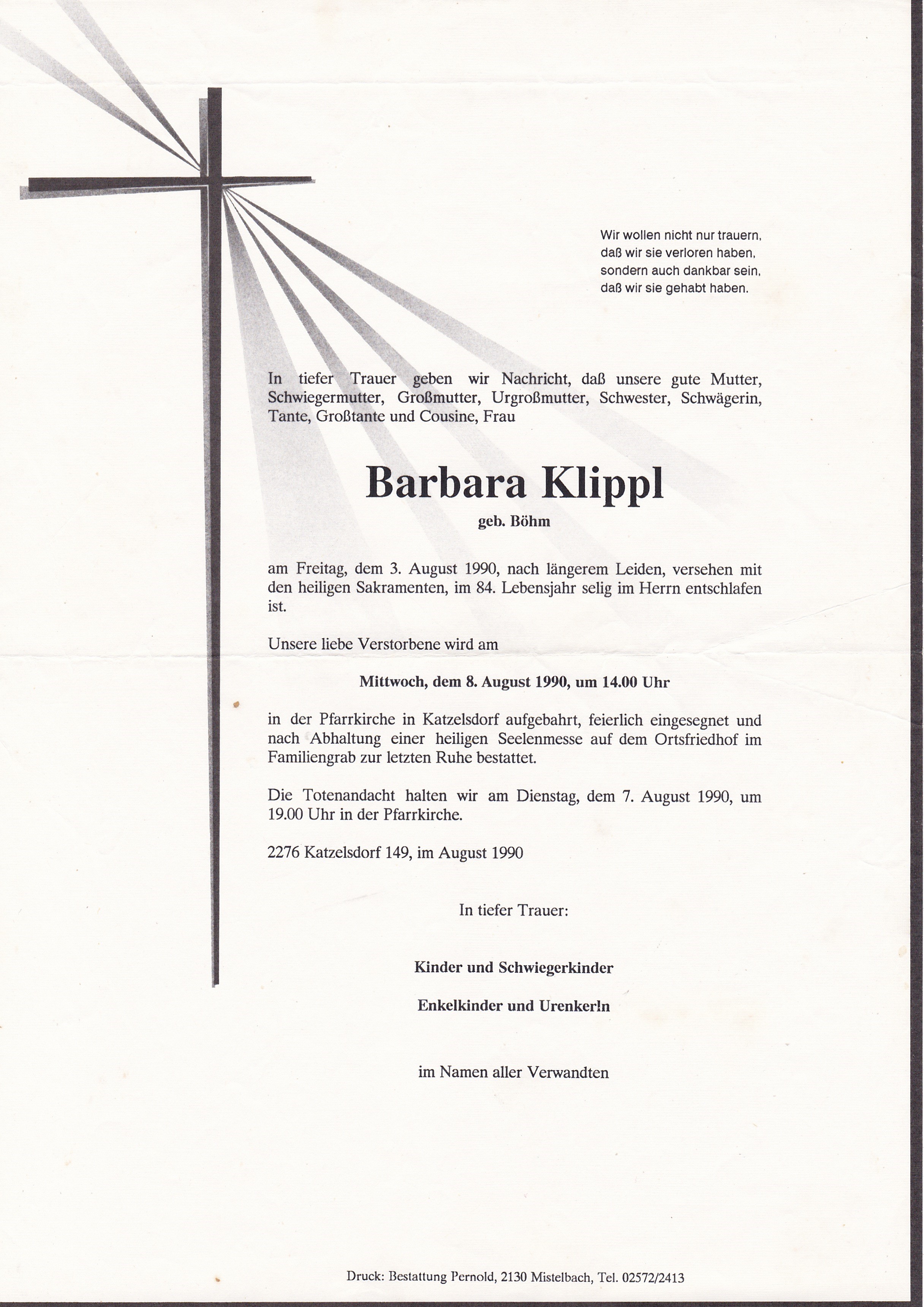 8  Klippl Barbara (Böhm) Hauptstraße 149 - *23.04.1907 +03.08.1990 |