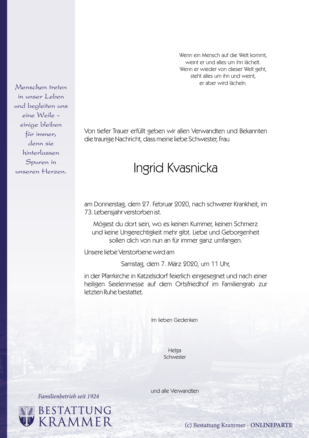Kvasnicka Ingrid Radschin - *07.03.1947 +27.02.2020 |