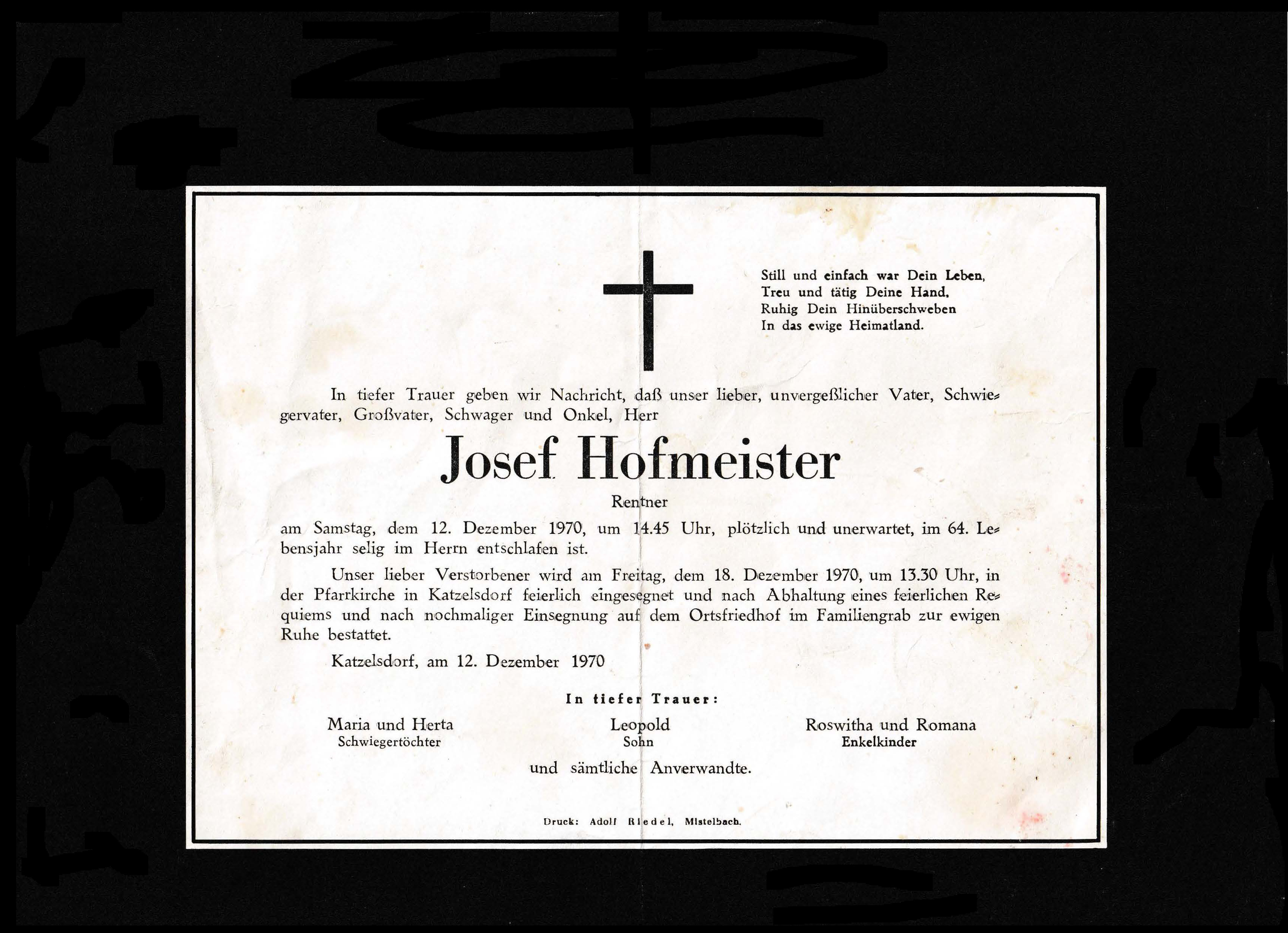 12 Hofmeister Johann Hauptstraße 71 - *20.07.1888 +03.11.1970 |