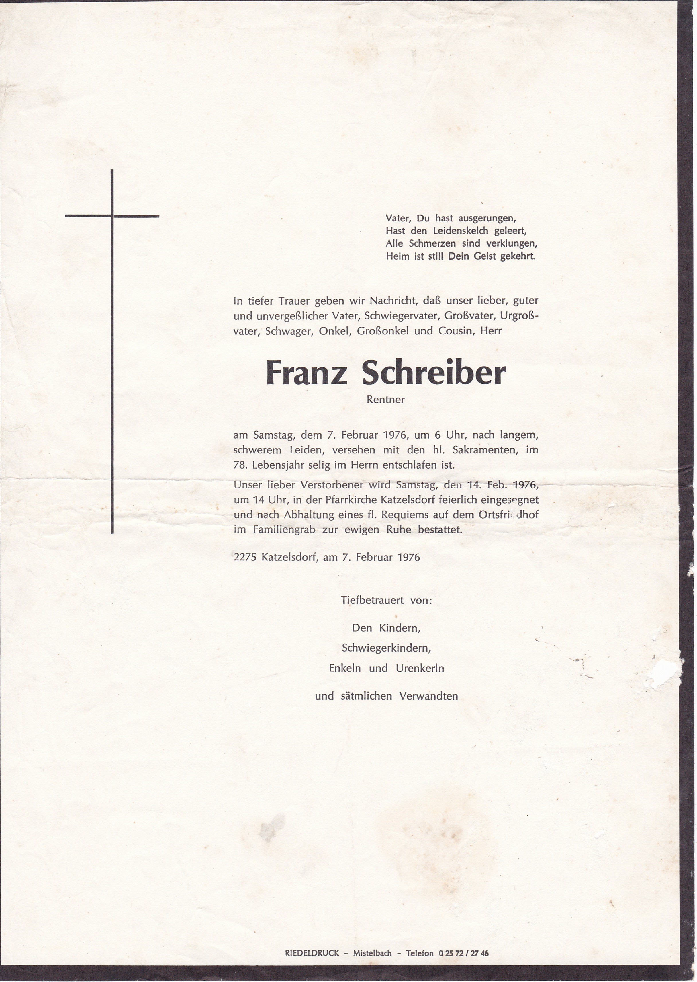 1 Schreiber Franz Bachzeile 216 Katzelsdorf - Niederabsdorf 134 - *31.12.1898 +07.02.1976 |