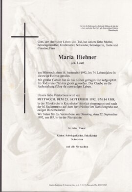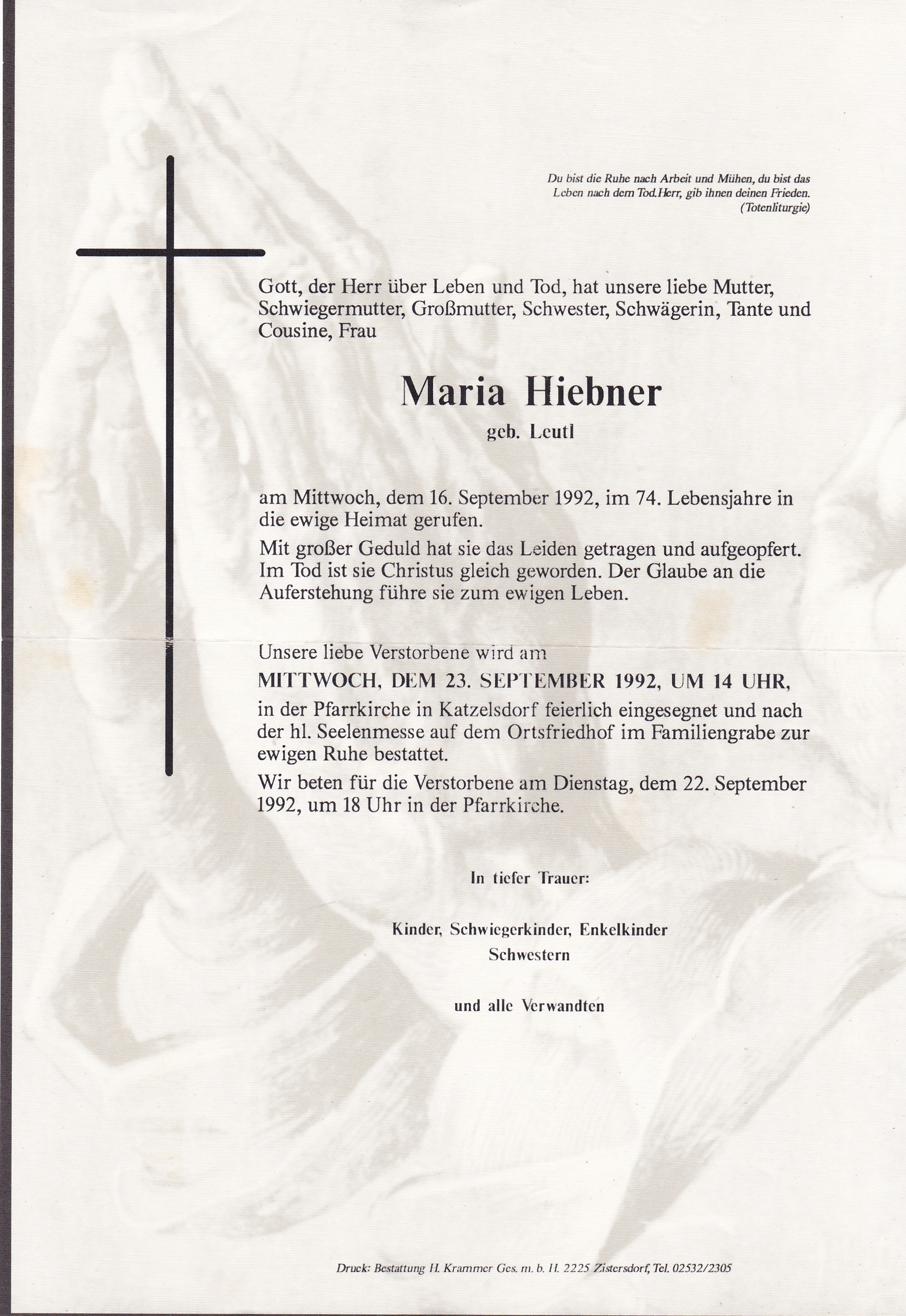 15  Hiebner Maria(Leutl) Hauptstraße 8 - *26.08.1919 +16.09.1992 |