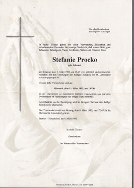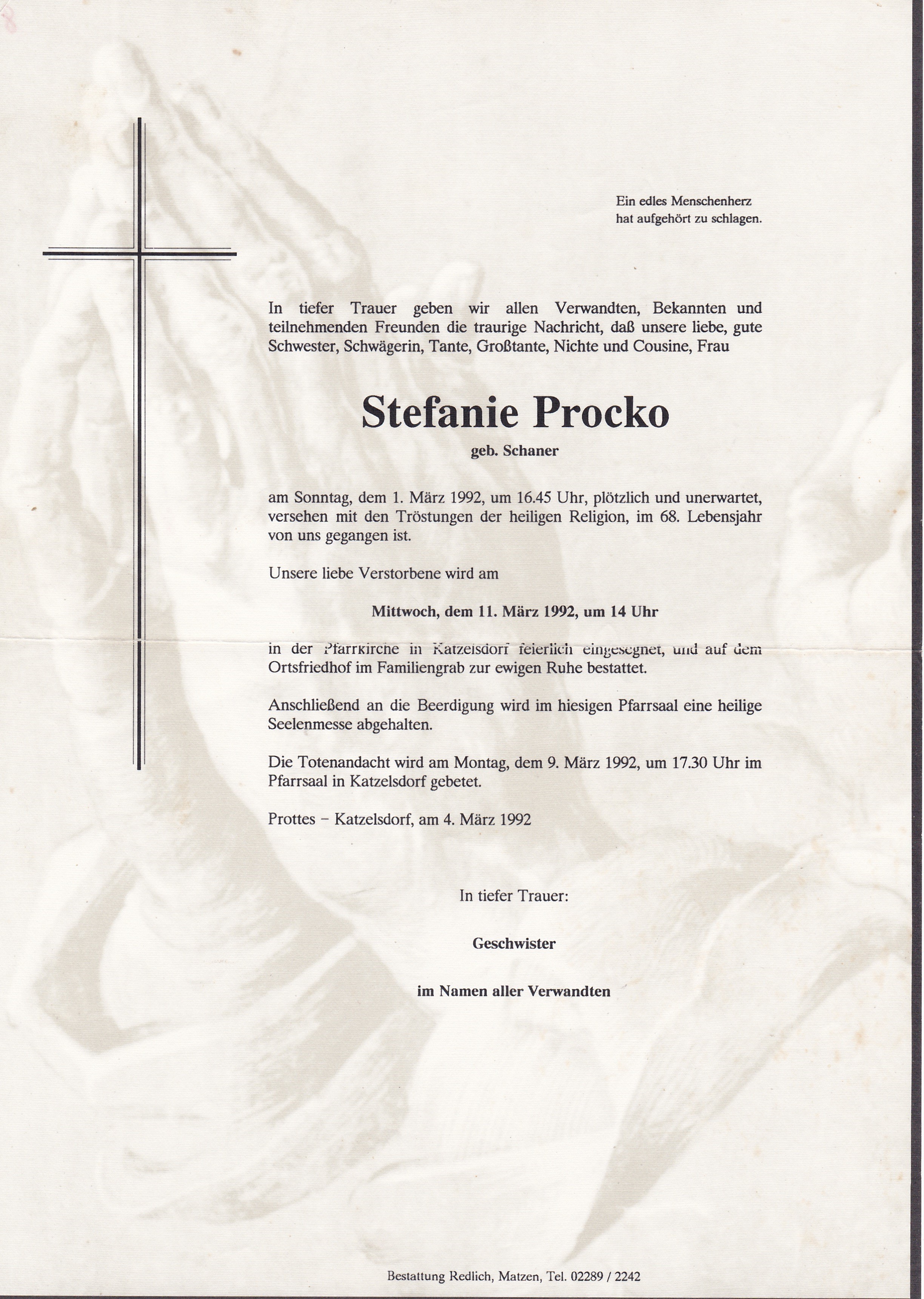 8  Procko Stefanie(Schaner) Katzelsdorf - Prottes - *08.08.1924 +01.03.1992 |