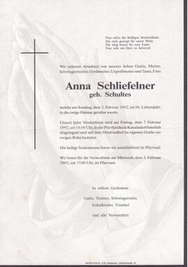 3 Schliefelner Anna Österreicher vw (Schultes) Hauptstraße 110 - *01.05.1898 +02.02.1992 |