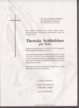 10  Schliefelner Theresia (Hofer) Hauptstraße 30 - *11.05.1903 +07.04.1992 |