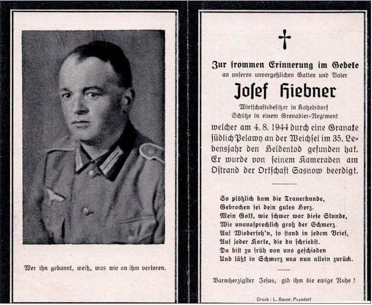 17  Hiebner Josef Hauptstraße 55 Pelawy a.d. Weichel, Polen- *04.06.1910  04.08.1944 |