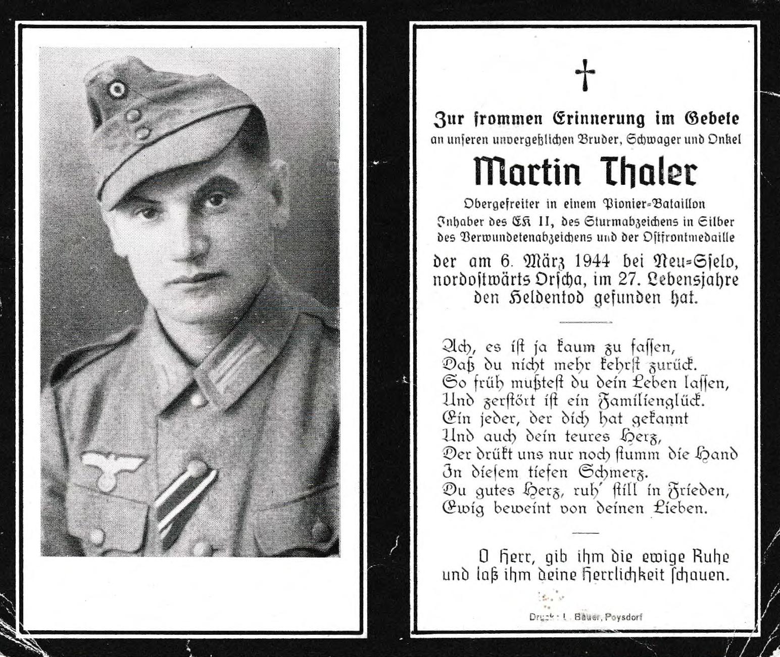 61  Thaler Martin Hauptstraße 23 Neudorf Neu-Sselo Orscha/Russland- *14.06.1917  06.03.1944 |