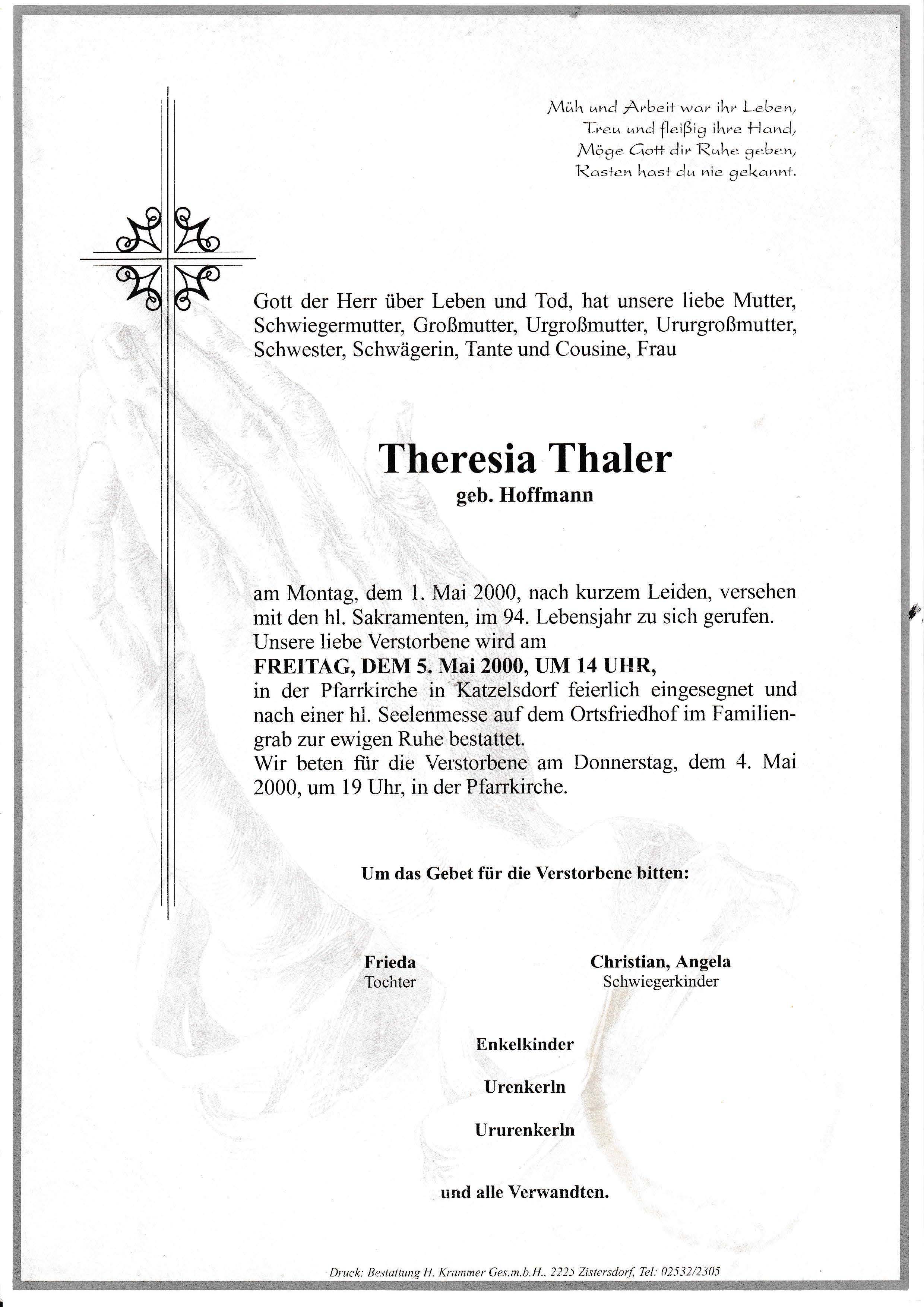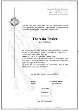 4  Thaler Theresia (Hoffmann) Bachzeile 190 - *30.09.1906 +01.05.2000 |