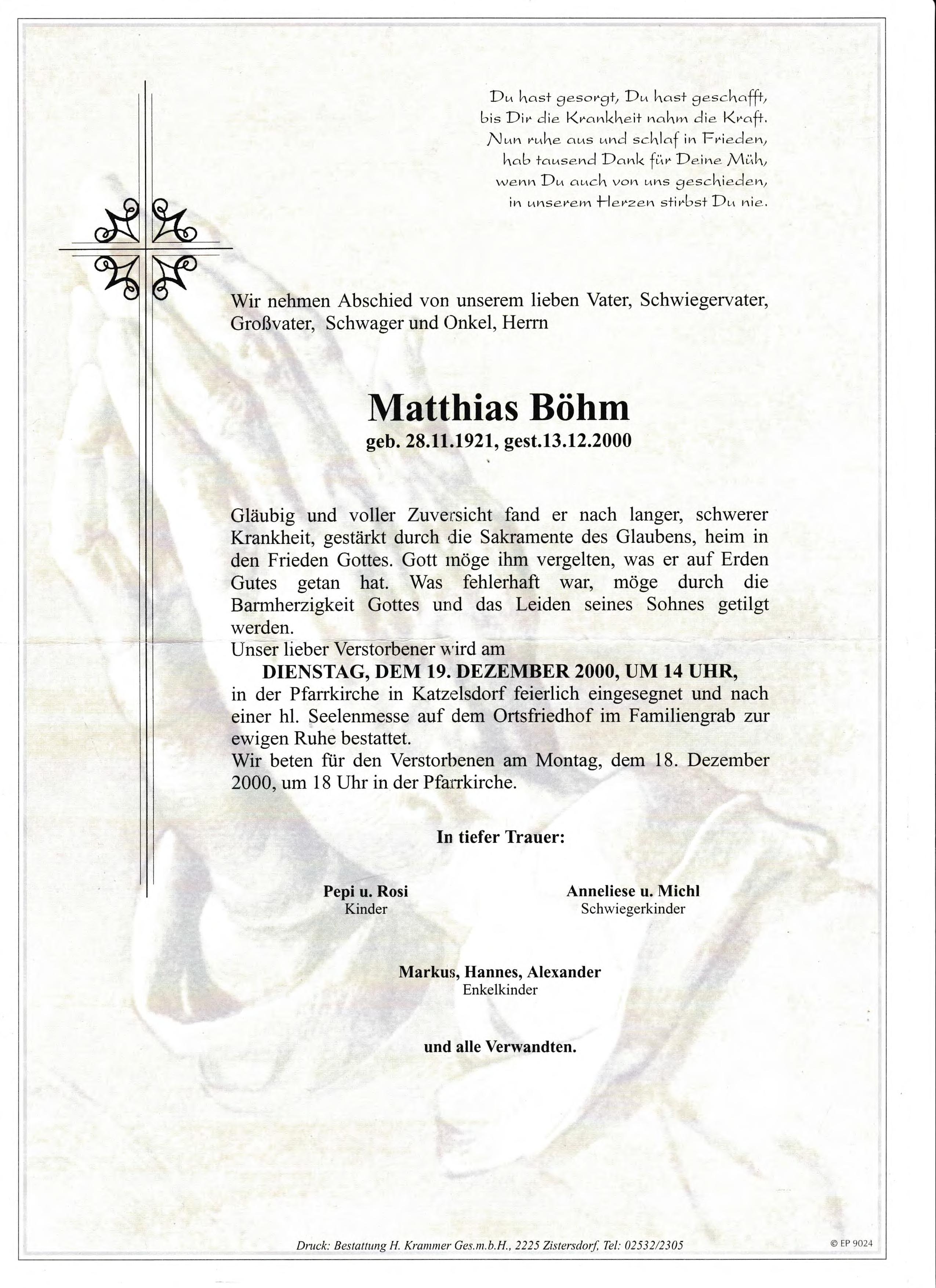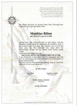 9  Böhm Matthias Hauptstraße 60 - *28.11.1921 +13.12.2000 |