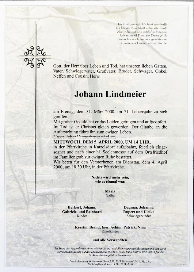 1  Lindmeier Johann Bachzeile 247 - *07.08.1929 +31.03.2000 |