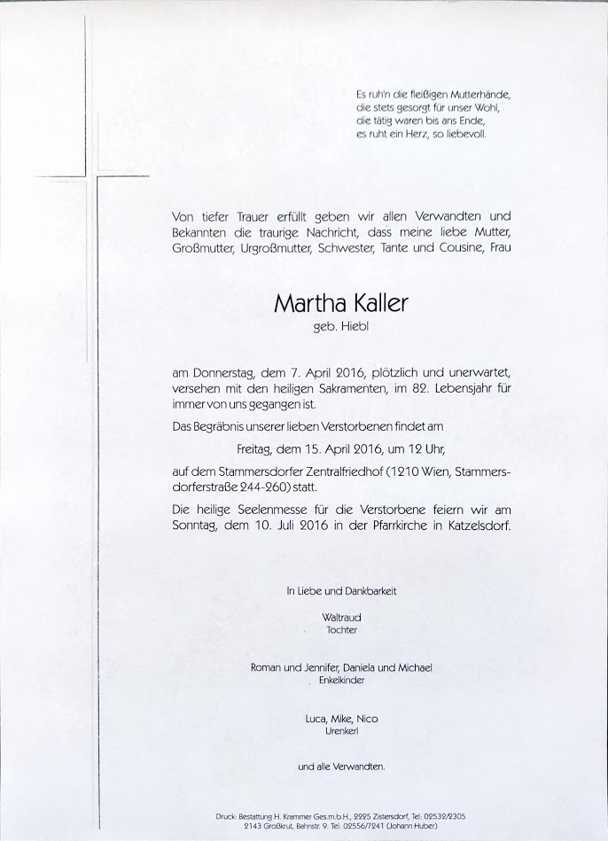 5 Kaller Martha (Hiebl) Bachzeile 266 - *08.07.1934 +07.04.2016 |