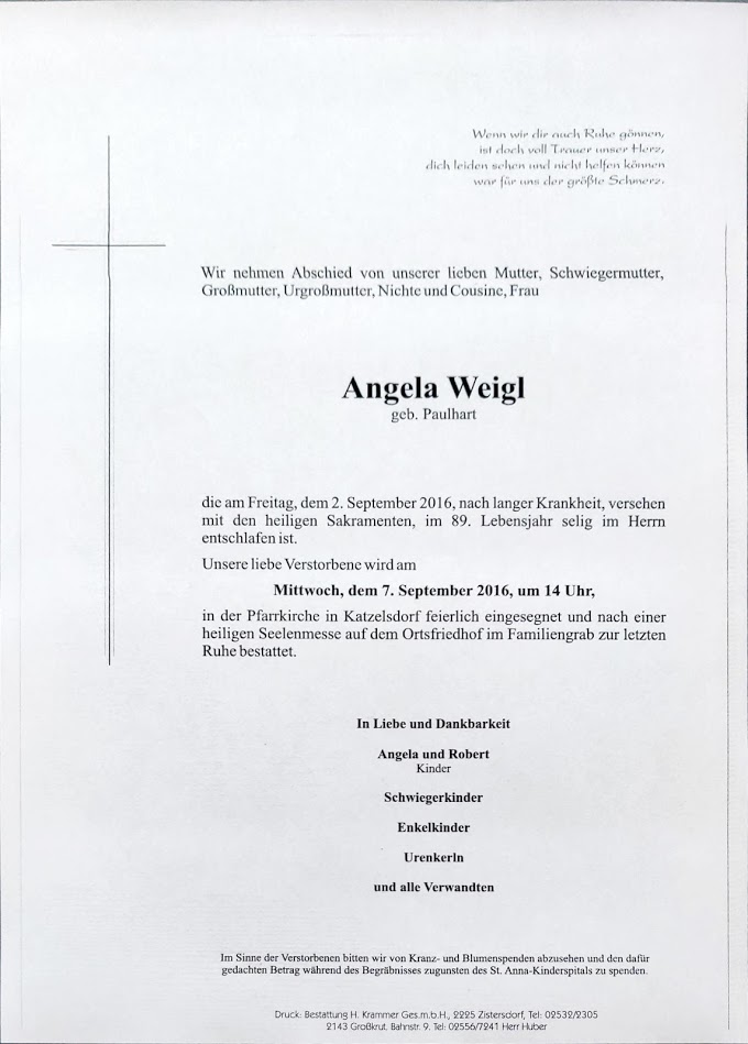 Weigl Angela (Paulhart) Bachzeile 229 - *29.04.1928 +02.09.2016 |