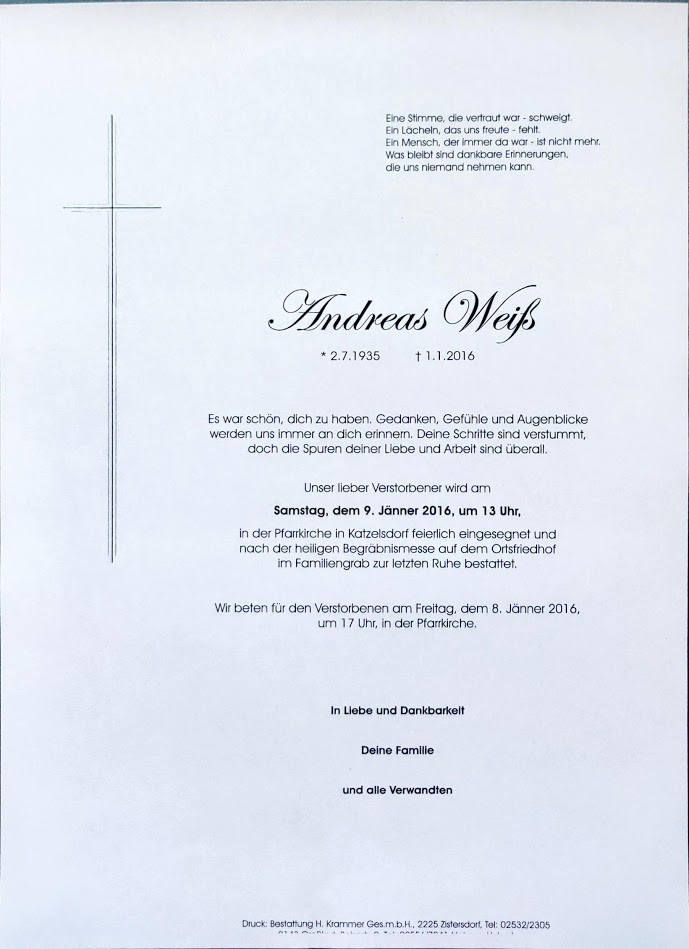 1 Weiß Andreas Hauptstraße 14 -*02.07.1935 +01.01.2016 |