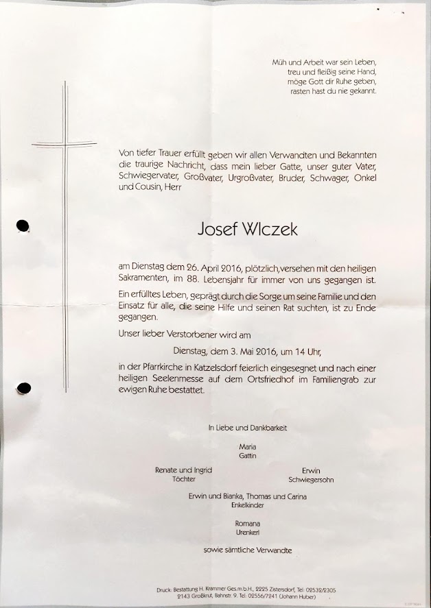 6 Wlczek Josef Schulgasse 252 - *14.04.1929 +26.04.2016 |